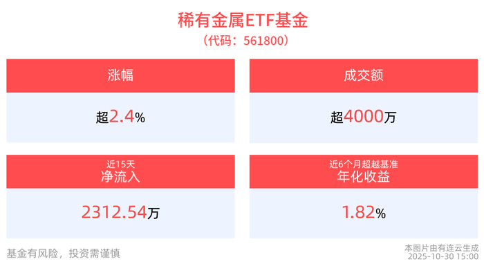 2025年10月30日,A股市场震荡调整;从板块来看,午后锂矿概念持续拉升。场内ETF方面,截至10月30日收盘,中证稀有金属主题指数(930632)强势上涨2.25%,成分股天华新能(300390)上涨14.69%,永兴材料(002756)、江特电机(002176)10cm涨停,天齐锂业(002466),西藏矿业(000762)等个股跟涨。稀有金属ETF基金(561800)收涨2.46%。拉长时间看,截至2025年10月29日,稀有金属ETF基金近1周累计上涨9.24%。