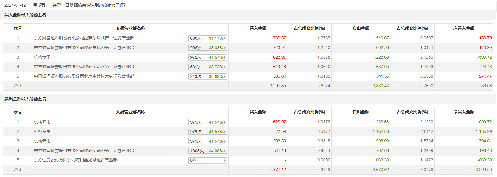 1月12日,御银股份今日跌8.57%,全天换手率达16.39%,振幅达9.39%。龙虎榜数据显示,营业部席位合计净卖出2738.86万元。其中,机构买入859.94万元,卖出3299.56万元,合计净卖出2439.62万元。此外,东方财富证券拉萨团结路第二证券营业部、东方证券海口金龙路证券营业部分别卖出707.66万元、663.39万元;东方财富证券拉萨东环路第一证券营业部、东方财富证券拉萨东环路第二证券营业部分别买入739.37万元、723.51万元。