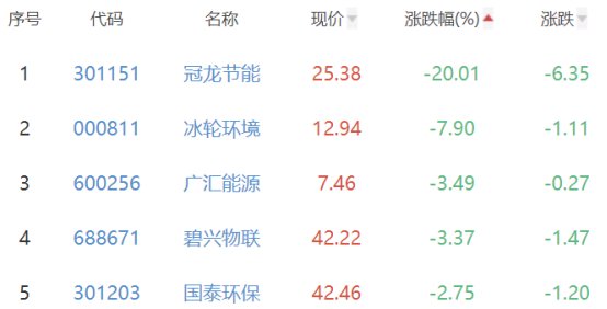 冠龙节能、冰轮环境、广汇能源、碧兴物联、国泰环保位列板块涨幅榜后五位,涨幅分别为-20.01%、-7.90%、-3.49%、-3.37%、-2.75%。
