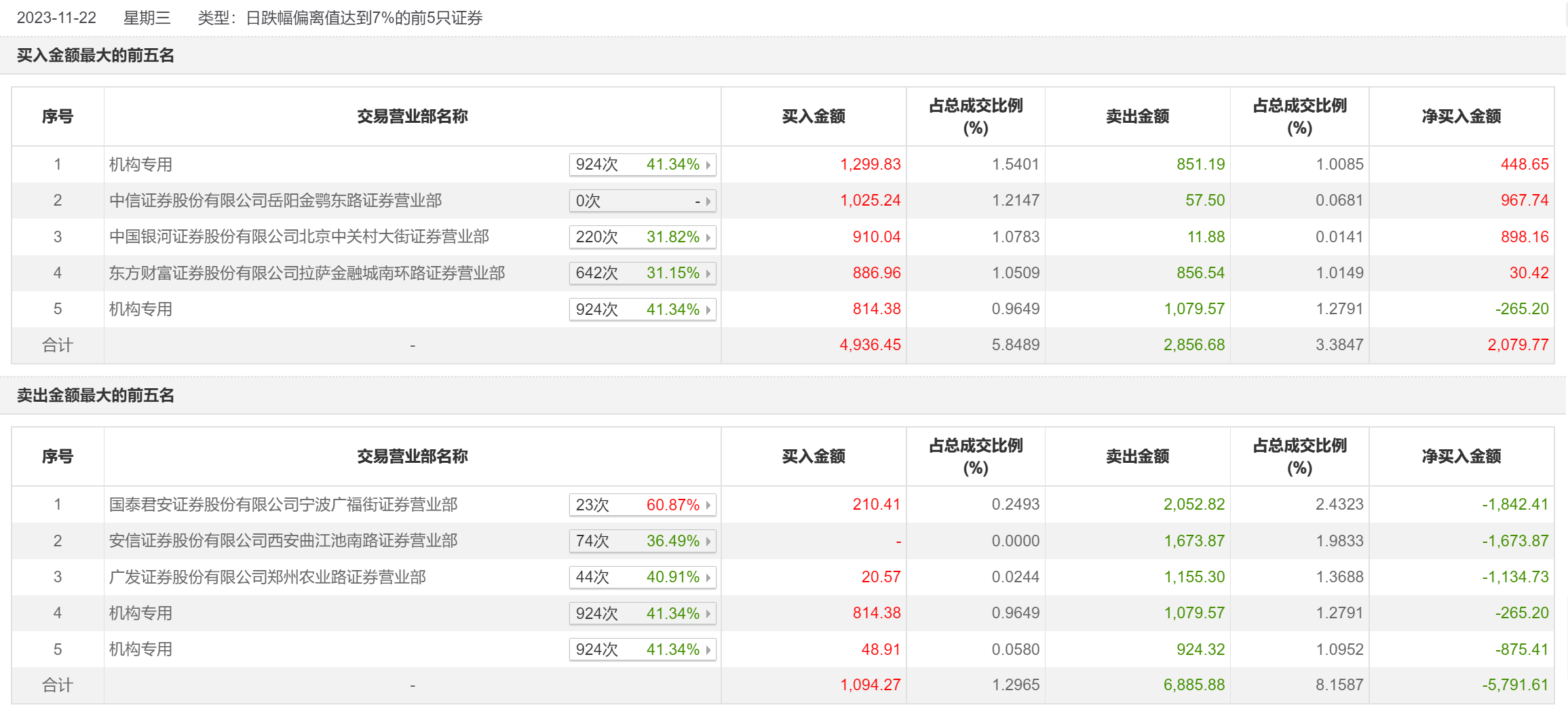 11月22日,延华智能今日跌停,全天换手率达19.54%,振幅达8.48%。龙虎榜数据显示,营业部席位合计净卖出3446.65万元。其中,机构买入2163.13万元,卖出2855.08万元,合计净卖出691.95万元。此外,国泰君安证券宁波广福街证券营业部、安信证券西安曲江池南路证券营业部分别卖出2052.82万元、1673.87万元;中信证券岳阳金鹗东路证券营业部、中国银河证券北京中关村大街证券营业部分别买入1025.24万元、910.04万元。