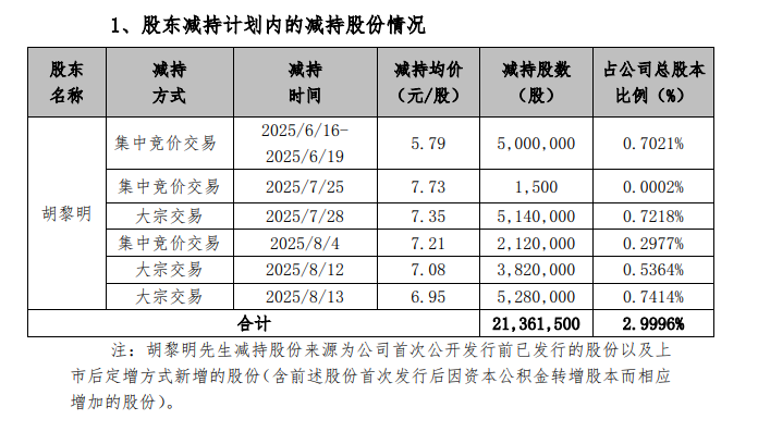 8月15日,延华智能(维权)(002178)公告称,8月12日至8月13日期间,胡黎明通过大宗交易方式合计减持公司股份9,100,000股,减持股份数量占公司总股本比例的1.2778%。截至本公告披露日,胡黎明的减持计划已实施完成,其累计减持21,361,500股,占公司总股本比例2.9996%。