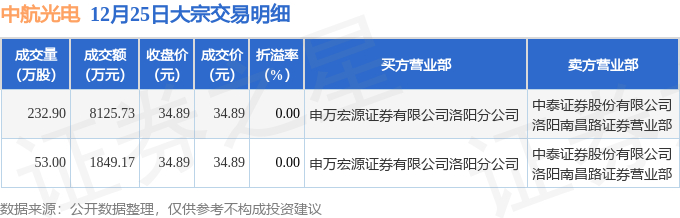 12月25日中航光电发生2笔大宗交易 成交金额9974.9万元