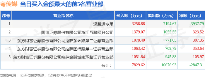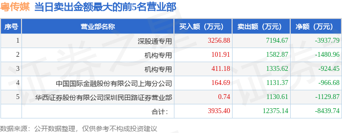 11月6日粤传媒(002181)龙虎榜数据:机构净卖出2405.4万元,北向资金净卖出3937.79万元