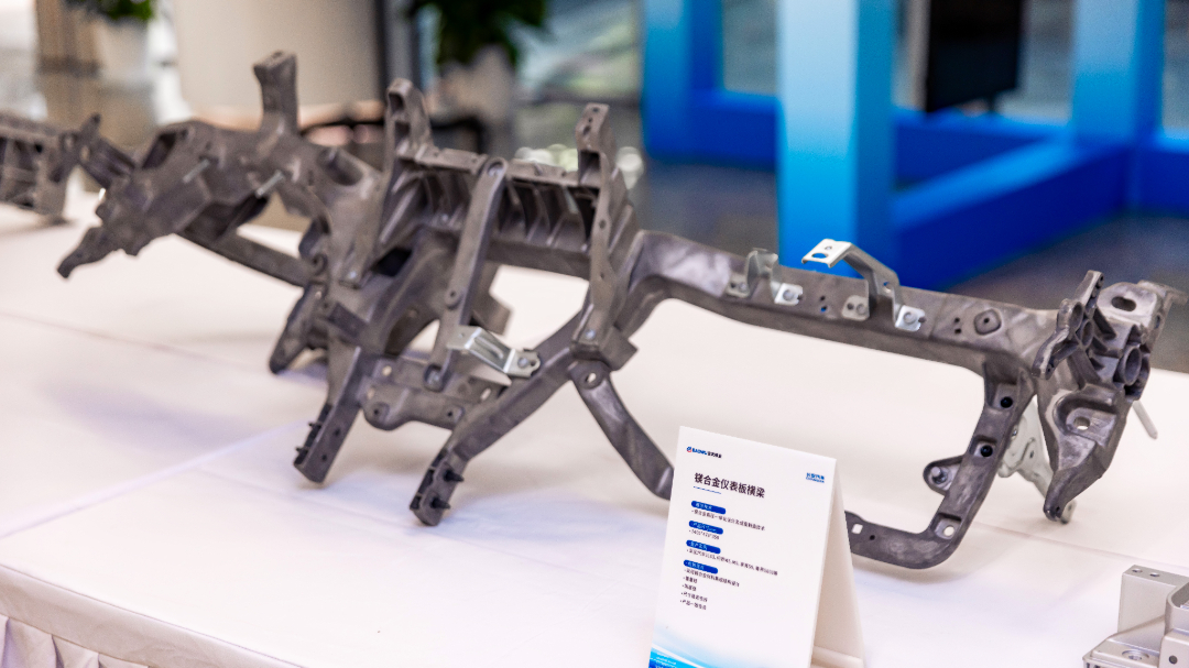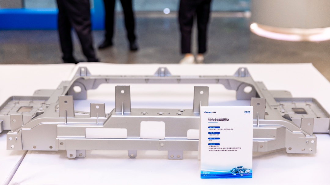 本次技术展集中展示了宝武镁业及其旗下博奥镁铝在汽车轻量化领域的前沿材料、先进工艺与系统解决方案。展品涵盖车身系统、座舱、电池系统、电驱系统、底盘系统等新能源汽车关键领域,包括镁合金仪表板横梁、镁合金后地板前段盖板组件、镁合金座椅靠背、镁合金踏板骨架、镁合金中控支架等一系列“硬核”成果。这些展品直观体现了镁铝合金在减重、提效、降耗方面的卓越性能,充分彰显了宝武镁业雄厚的技术实力。