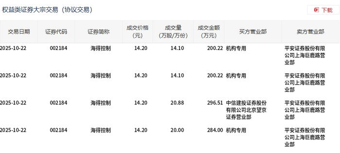 海得控制今日大宗交易折价成交69.08万股,成交额980.95万元