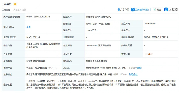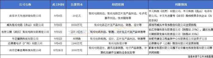 9月5日,华芯徽测科技有限公司完成工商注册登记。该公司是合肥市建设工程监测中心有限责任公司的全资子公司,注册地址位于合肥市高新区,经营范围包括集成电路检测、集成电路设计、集成电路芯片及产品制造、集成电路芯片及产品销售等。