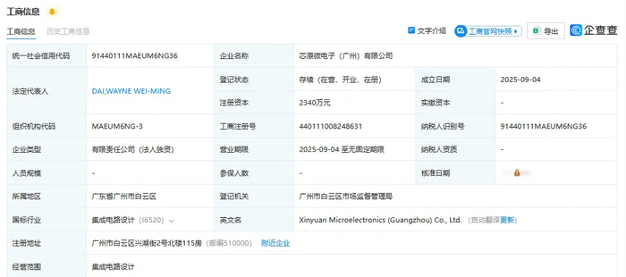 9月4日,芯原微电子(广州)有限公司(简称“芯原广州”)顺利完成企业注册,正式在广州市白云区落户。该公司注册资本为2340万元人民币,由芯原微电子(上海)股份有限公司(简称“芯原股份”)全资持股。芯原广州的经营范围包括集成电路设计。
