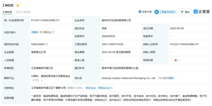9月8日,华天科技完成了其全资子公司南京华天先进封装有限公司的工商登记注册。该公司由华天科技的全资子公司华天科技(江苏)有限公司、华天科技(昆山)电子有限公司及全资下属合伙企业华天先进壹号(南京)股权投资合伙企业(有限合伙)共同出资设立,注册资本总额为20亿元人民币。南京华天先进封装有限公司的经营范围包括集成电路制造、集成电路芯片及产品制造、电子元器件制造、技术服务等。