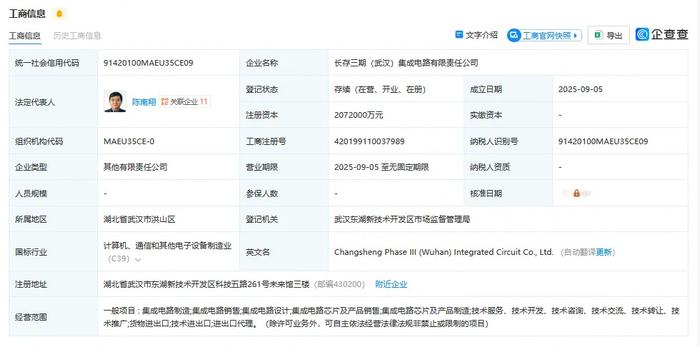 长江存储启动三期布局,新公司注册资本达207.2亿元