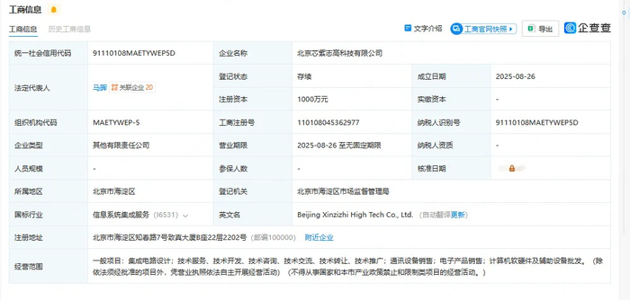 近期,北京芯紫志高科技有限公司正式成立,法定代表人为马晖,注册资本1000万元人民币。该公司由新紫光集团有限公司旗下北京紫光科技发展有限公司、北京广大融信科技有限公司、北京芯紫信息技术合伙企业(有限合伙)共同持股。北京芯紫志高科技有限公司的经营范围包括集成电路设计、通讯设备销售、电子产品销售、计算机软硬件及辅助设备批发等。