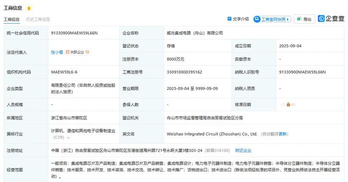 9月8日,威兆集成电路(舟山)有限公司正式成立,注册资本为8000万元人民币。该公司由深圳市威兆半导体股份有限公司全资持股,法定代表人为张小青。公司的经营范围包括集成电路芯片及产品制造、集成电路芯片及产品销售、集成电路设计等。