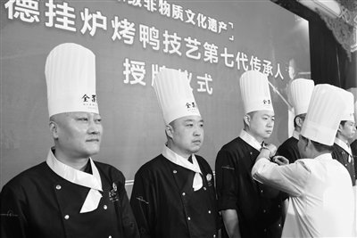 昨天,全聚德迎来了159周岁生日。“传承之火向新而生——庆祝全聚德创建159周年”庆典活动现场,全聚德掌门人周延龙为16位全聚德挂炉烤鸭技艺第七代传承人佩戴传承人徽章。