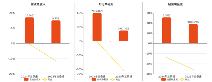 公司营业总收入为9.58亿元,较去年同报告期营业总收入减少1.26亿元,同比较去年同期下降11.62%。归母净利润为2617.39万元,较去年同报告期归母净利润减少4427.77万元,同比较去年同期下降62.85%。经营活动现金净流入为9686.39万元,较去年同报告期经营活动现金净流入减少3341.12万元,同比较去年同期下降25.65%。