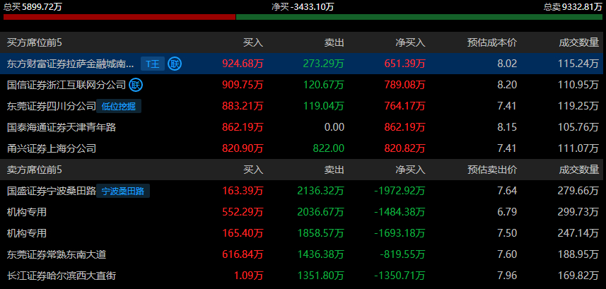 中天服务(002188)今日跌9.91%,成交额8.61亿元,换手率46.40%,盘后龙虎榜数据显示,有2家机构专用席位净卖出3177.56万元。宁波桑田路席位净卖出1972万元。