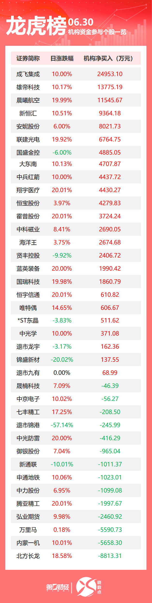 盘后数据显示,6月30日龙虎榜中,共38只个股出现了机构的身影,24只股票呈现机构净买入,14只股票呈现机构净卖出。