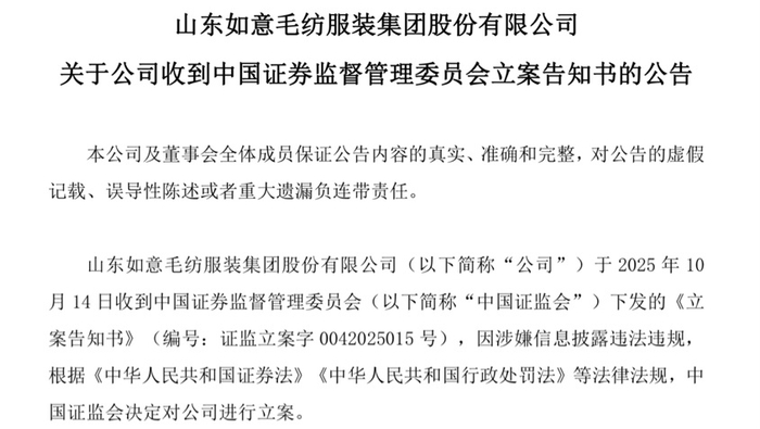 因涉嫌信息披露违法违规,中国证监会日前决定对如意集团进行立案