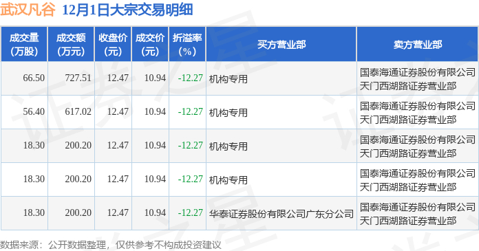 12月1日武汉凡谷现5笔折价12.27%的大宗交易 合计成交1945.13万元