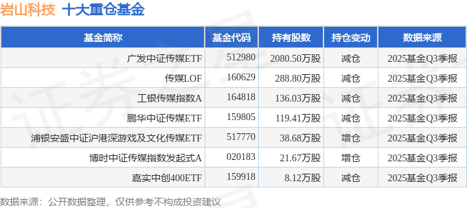 持有岩山科技最多的基金为广发中证传媒ETF,目前规模为29.84亿元,最新净值0.9862(10月29日),较上一交易日上涨1.49%,近一年上涨25.79%。该基金现任基金经理为罗国庆。