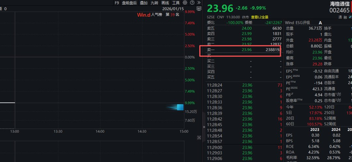 海格通信上午牢牢封住跌停,截至中午收盘卖一位置有近2.4亿股巨量卖单,上述卖单折合市值超过57亿元。海格通信为近期A股市场的大牛股之一,最近一个月时间里股价最大涨幅超过100%。