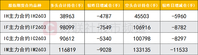 四大期指主力合约中,IH、IF、IC、IM合约多空双方均减仓,空头减仓数量较多。