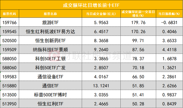 从成交额环比增长前十的ETF来看,旅游ETF(159766)成交额环比增长179%位居首位;恒生红利低波ETF易方达(159545)成交额环比增长170%位居次席。