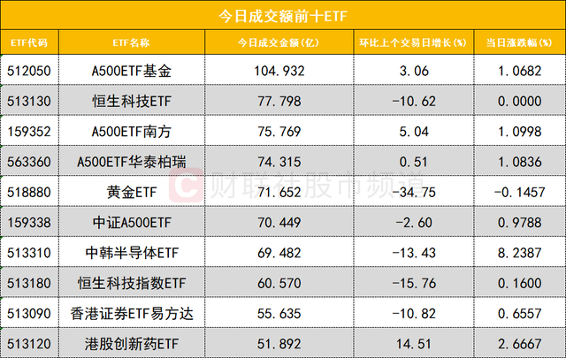 从成交额前十的ETF来看,A500ETF基金(512050)成交额位居首位,恒生科技ETF(513130)成交额位居次席。