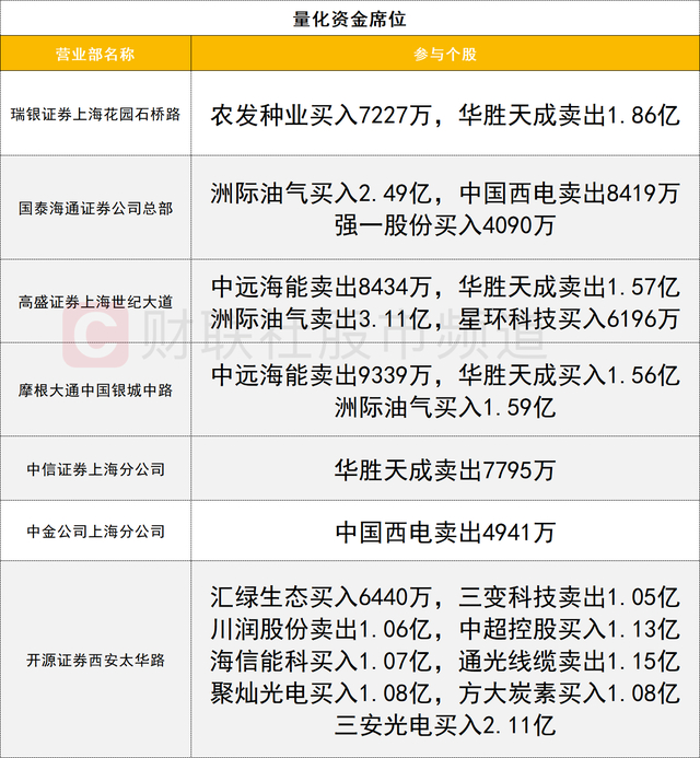 量化资金活跃度较高,洲际油气遭量化资金激烈博弈,两家量化(国泰海通证券公司总部、摩根大通中国银城中路)合计买入4.08亿,一家量化(高盛证券上海世纪大道)卖出3.11亿。