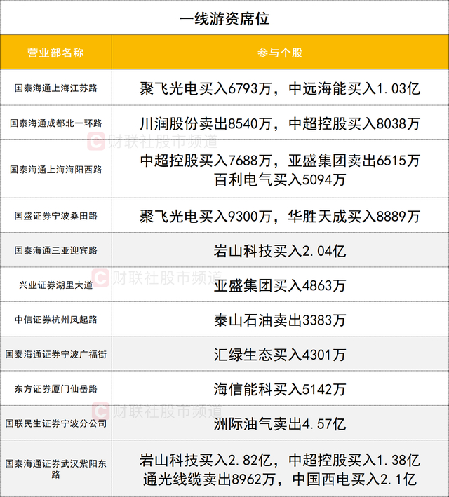一线游资活跃度一般,岩山科技获两家一线游资(国泰海通证券武汉紫阳东路、国泰海通证券三亚迎宾路)合计买入4.86亿。