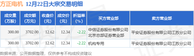 12月22日方正电机现2笔大宗交易 机构净买入3702万元