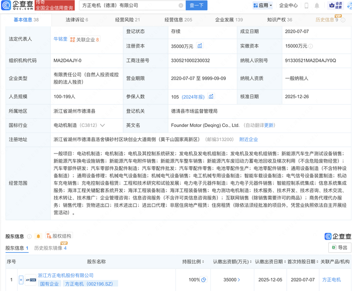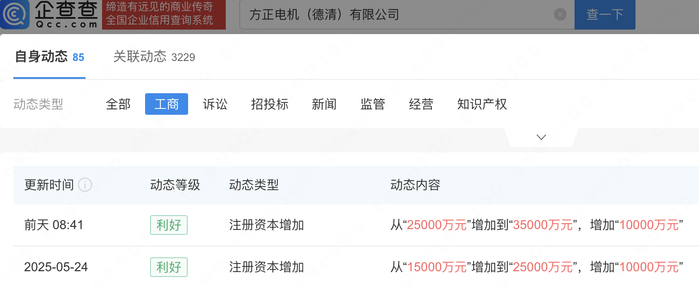 企查查APP显示,近日,方正电机(德清)有限公司发生工商变更,注册资本由2.5亿元增至3.5亿元。此前5月,该公司注册资本由1.5亿元增至2.5亿元。企查查信息显示,该公司成立于2020年,法定代表人为牛铭奎,经营范围包含:电动机制造;电机制造;电机及其控制系统研发;发电机及发电机组制造等,由方正电机(002196)全资持股。