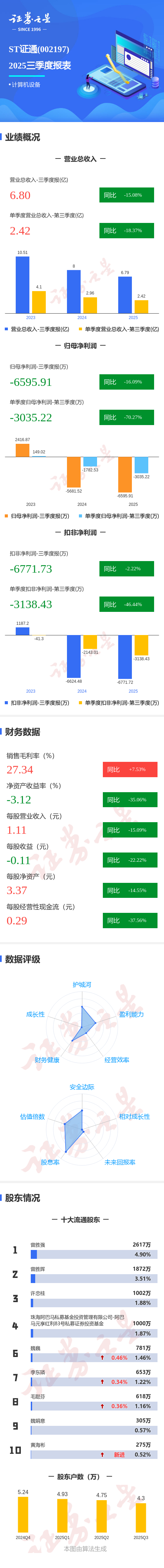证券之星消息,ST证通2025年三季报显示,前三季度公司主营收入6.8亿元,同比下降15.09%;归母净利润-6595.91万元,同比下降16.09%;扣非净利润-6771.73万元,同比下降2.22%;其中2025年第三季度,公司单季度主营收入2.42亿元,同比下降18.37%;单季度归母净利润-3035.22万元,同比下降70.28%;单季度扣非净利润-3138.43万元,同比下降46.45%;负债率62.21%,投资收益-438.15万元,财务费用5424.06万元,毛利率27.34%。