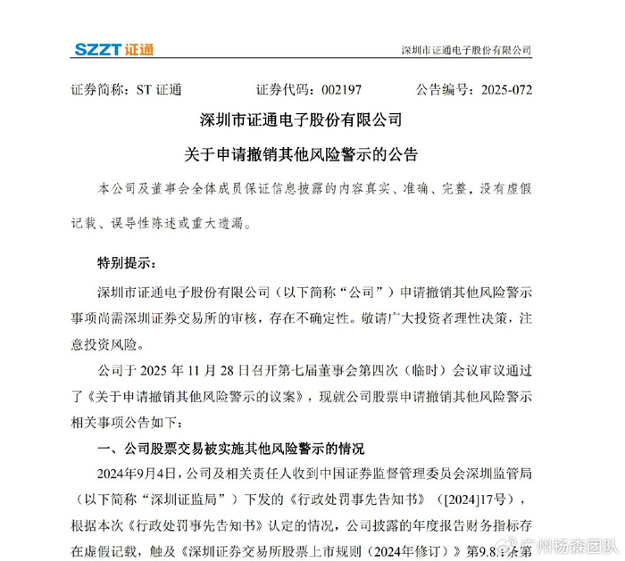 2025年11月29日,ST证通002197披露,公司于2025年11月28日召开董事会审议通过申请撤销该警示,理由包括:已对相关会计差错进行追溯重述并整改;自收到行政处罚决定书已满12个月;且目前无其他触及风险警示的情形。但公司仍面临754件投资者索赔案件,涉案金额约6925.34万元,结果尚不确定。