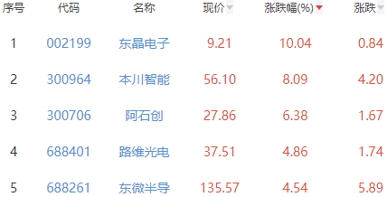 其中,东晶电子、本川智能、阿石创、路维光电和东微半导位列板块涨幅前五位,涨幅分别为10.04%、8.09%、6.38%、4.86%和4.54%。