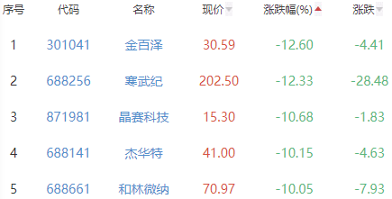 金百泽、寒武纪、晶赛科技、杰华特和和林微纳位列涨幅榜后五位,涨幅分别为-12.60%、-12.33%、-10.68%、-10.15%和-10.05%。