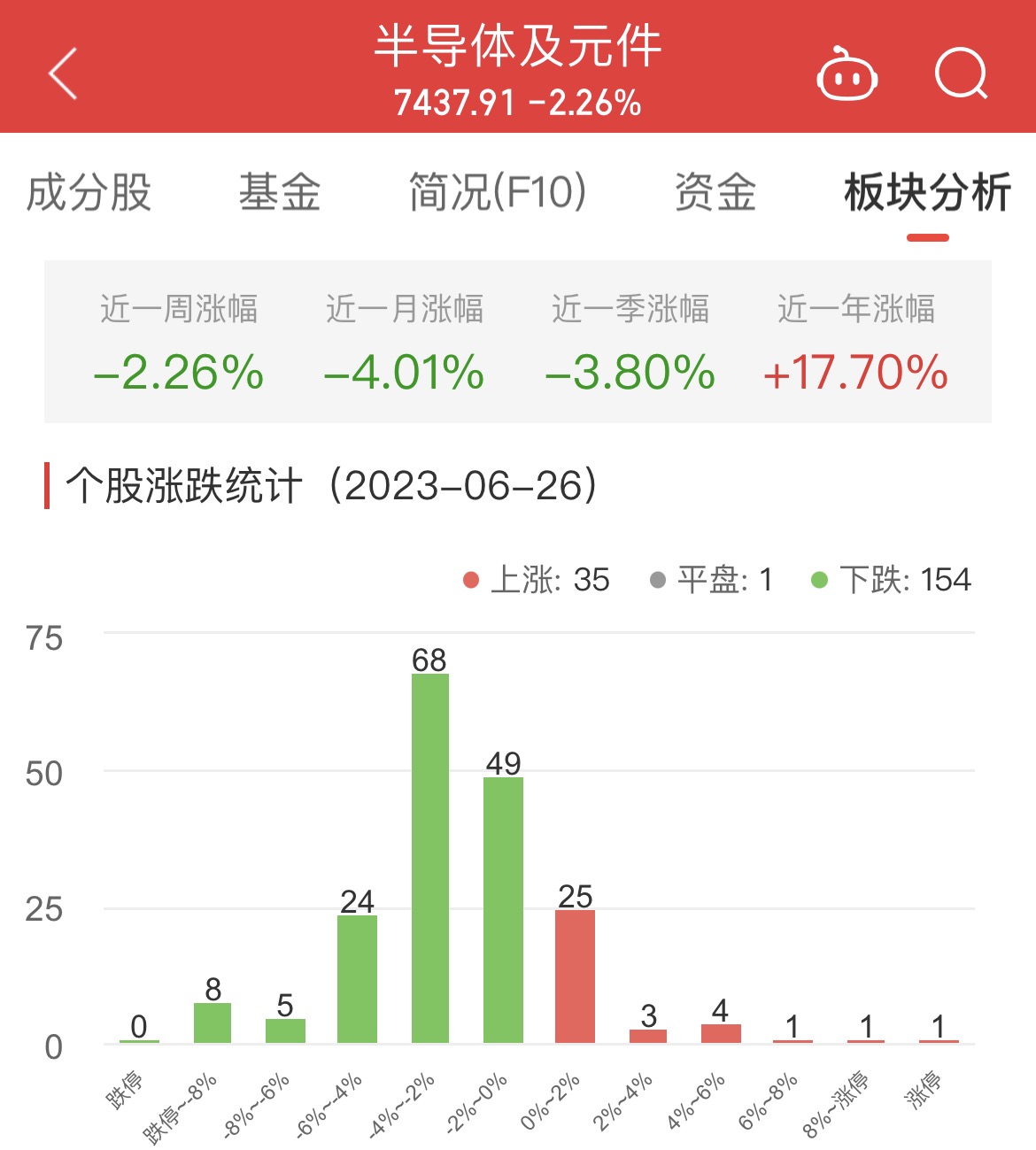 中国经济网北京6月26日讯今日,半导体及元件板块整体涨幅-2.26%,其中35只股票上涨,1只股票平盘,154只股票下跌。