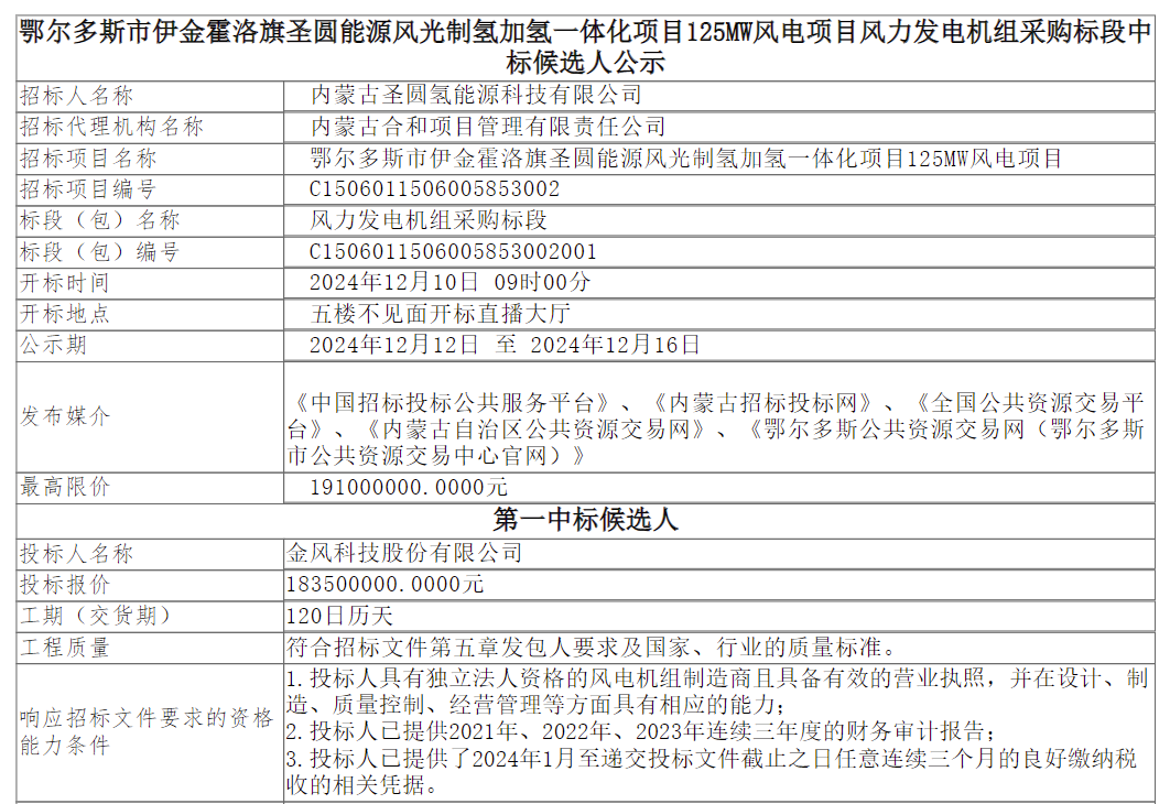 市伊金霍洛旗圣圆能源风光制氢加氢一体化项目125MW风电项目风力发电机组采购标段中标候选人公示,