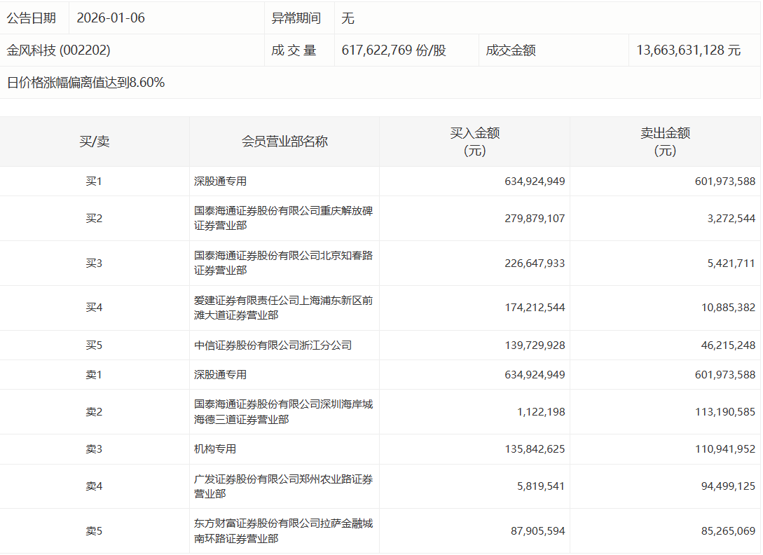 金风科技今日涨停 深股通买入6.35亿元并卖出6.02亿元
