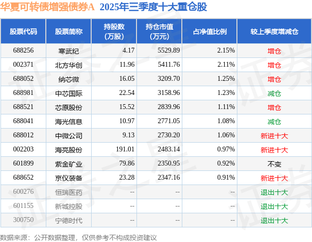 根据2025基金Q3季报公募基金重仓股数据,重仓该股的公募基金共5家,其中持有数量最多的公募基金为华夏基金的华夏可转债增强债券A。华夏可转债增强债券A目前规模为8.82亿元,最新净值1.7693(12月29日),较上一交易日下跌0.23%,近一年上涨32.52%。该公募基金现任基金经理为何家琪。何家琪在任的基金产品包括:华夏永福混合A,管理时间为2016年9月5日至今,期间收益率为87.81%;华夏鼎利债券发起式A,管理时间为2016年11月18日至今,期间收益率为95.01%;华夏聚利债券A,管理时间为2017年12月19日至今,期间收益率为85.33%。