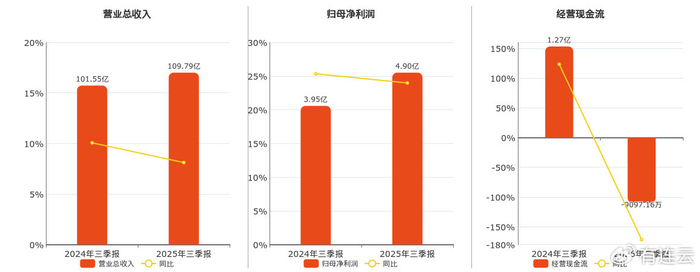 公司营业总收入为109.79亿元,较去年同报告期营业总收入增加8.24亿元,实现5年连续上涨,同比较去年同期上涨8.11%。归母净利润为4.90亿元,较去年同报告期归母净利润增加9469.22万元,实现5年连续上涨,同比较去年同期上涨23.97%。经营活动现金净流入为-9097.16万元。