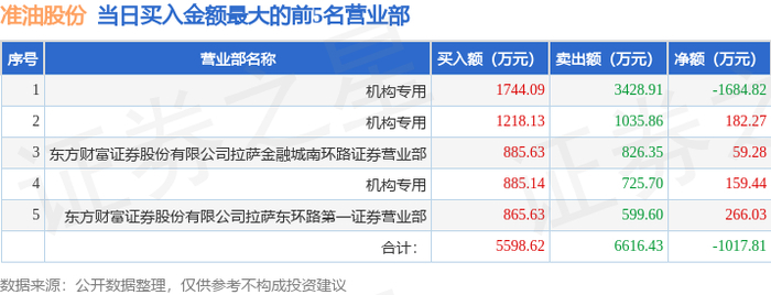 10月23日准油股份(002207)龙虎榜数据:机构净卖出1730.49万元