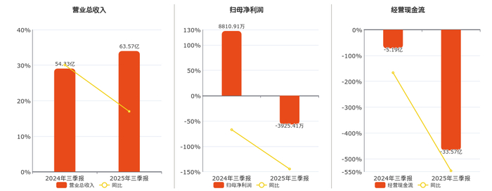 公司营业总收入为63.57亿元,较去年同报告期营业总收入增加9.23亿元,实现3年连续上涨,同比较去年同期上涨17.00%。归母净利润为-3925.41万元,较去年同报告期归母净利润减少1.27亿元,同比较去年同期下降144.55%。经营活动现金净流入为-33.57亿元,较去年同报告期经营活动现金净流入减少28.37亿元。