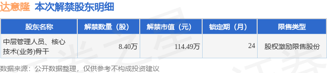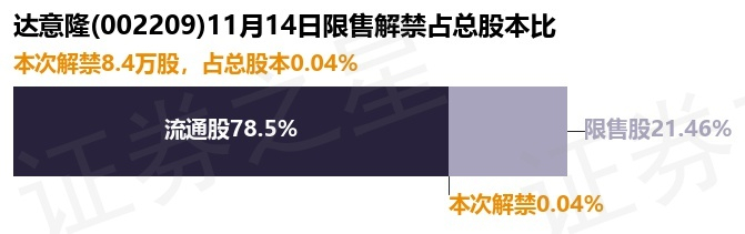 达意隆(002209)8.4万股限售股将于11月14日解禁,占总股本0.04%