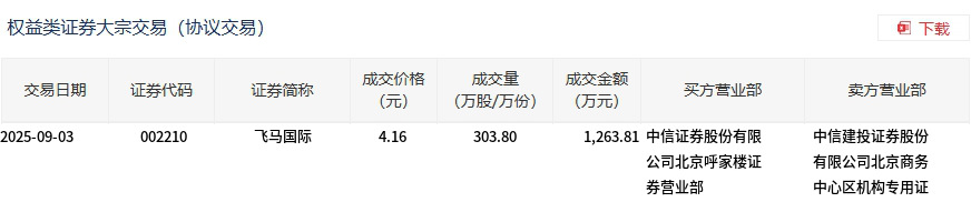 飞马国际今日大宗交易折价成交303.8万股,成交额1263.81万元