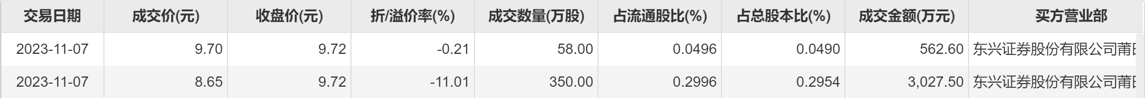 今日大宗交易成交408万股,成交额3590.1万元,占当日总成交额的14.93%,成交均价8.8元,较市场收盘价折价9.47%,其中最高成交价9.7元,最低成交价8.65元。