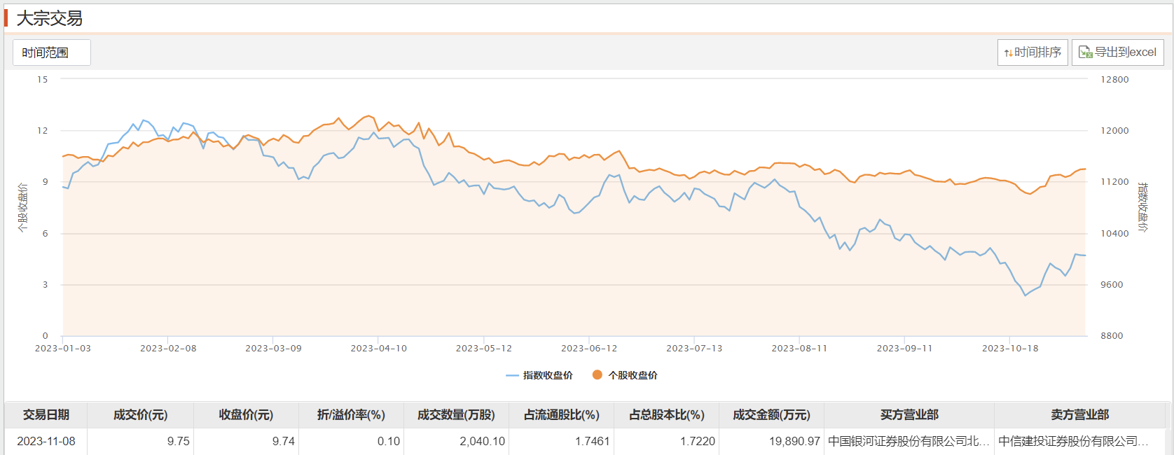 今日大宗交易成交2040.1万股,成交额1.99亿元,占当日总成交额的50.67%,成交价9.75元,较市场收盘价溢价0.1%。