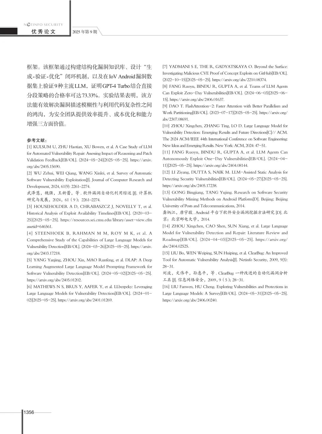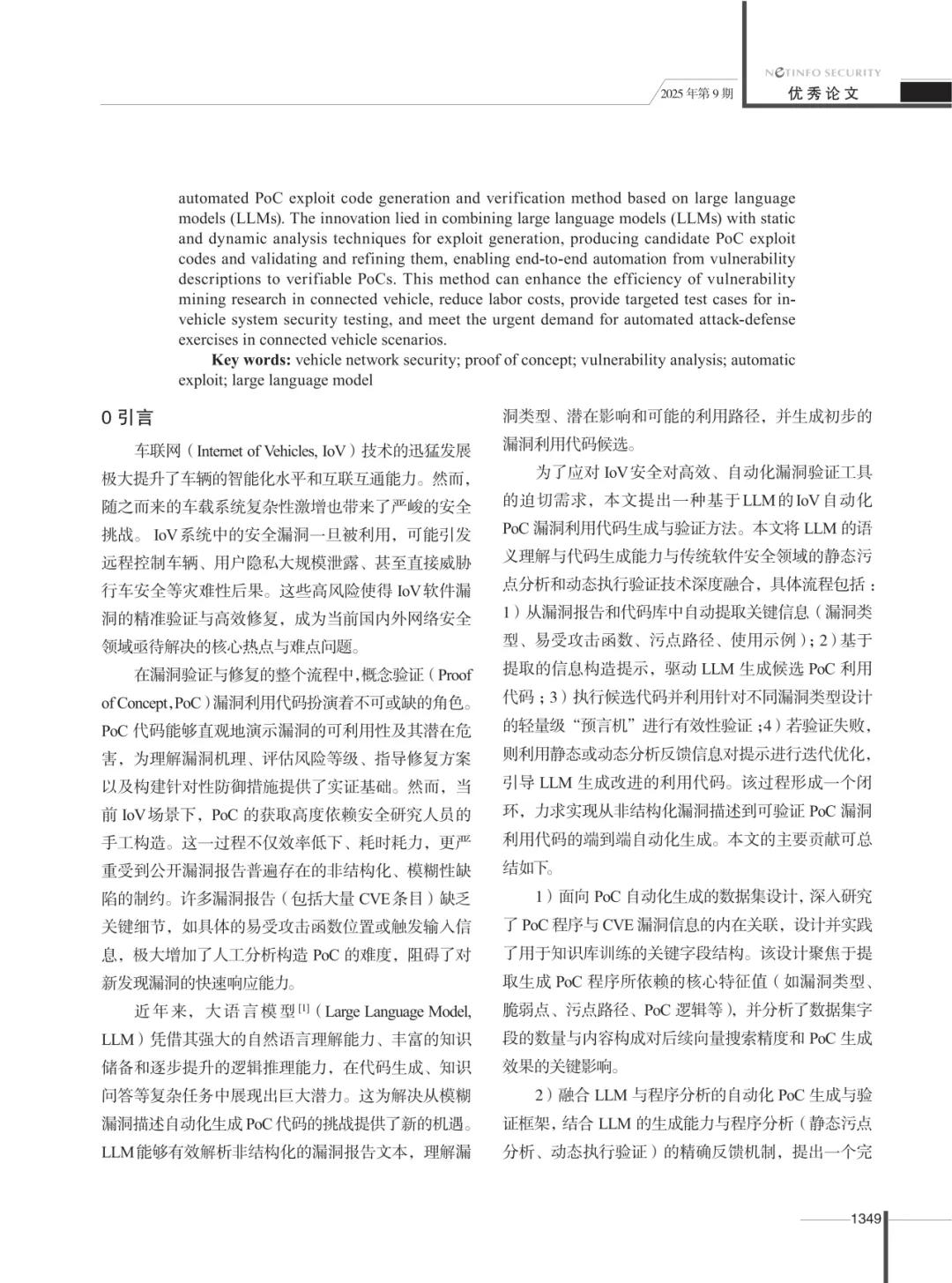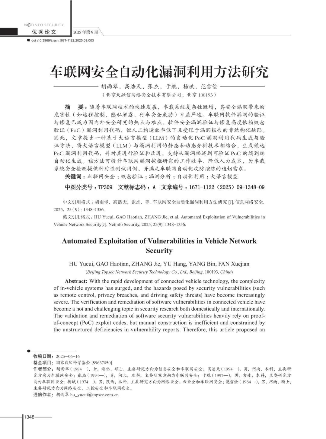 近期,第40次全国计算机安全学术交流会在津成功举行,本届优秀论文评选结果在活动现场重磅揭晓。继在第39届活动中获评唯一优秀论文后,本届活动中天融信撰写的《车联网安全自动化漏洞利用方法研究》从498篇论文中脱颖而出,再获评优秀论文,成为唯一的企业获奖论文,并刊登于《信息网络安全》2025年第9期。这一成果不仅展示了我国在车联网安全研究领域的最新突破,也凸显了人工智能技术在推动汽车产业安全升级中的重要价值。