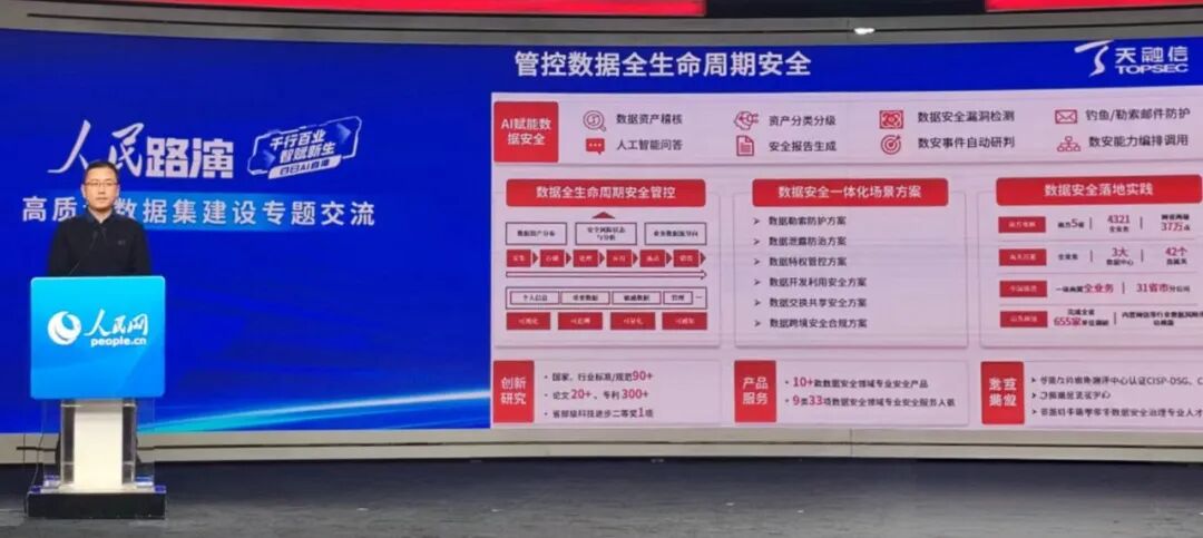 近日,由人民数据主办的“人民路演——高质量数据集专题交流”活动在京圆满举行。天融信科技集团受邀出席作主题分享,与参会嘉宾共同为数据安全领域的实践创新、价值释放与安全合规协同发展建言献策。