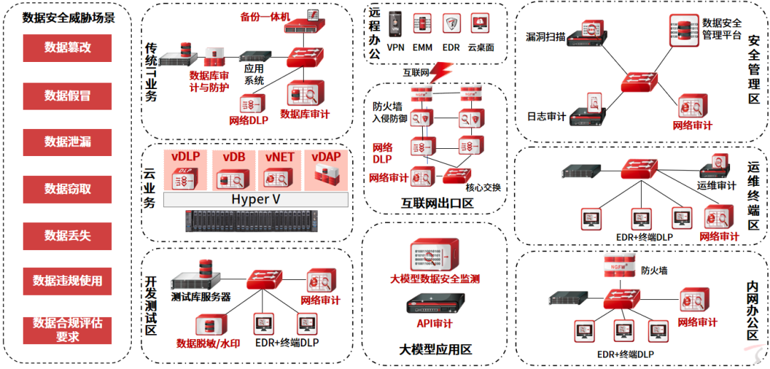 针对数据泄露风险高、流转路径不清晰等迫切需求,可优先部署数据防泄漏、API审计、数据库审计等核心安全产品,将多种安全设备的监测数据汇总至天融信数据安全管理平台,实现风险态势统一感知、集中分析,以轻量化投入快速构建基础防护体系,再逐步迭代升级。