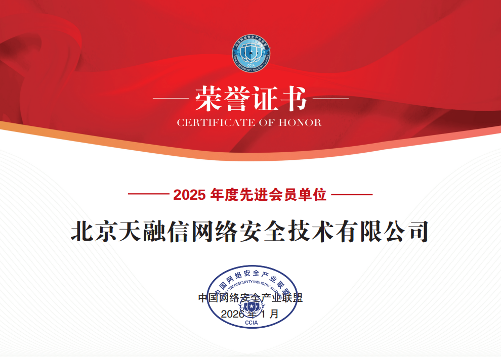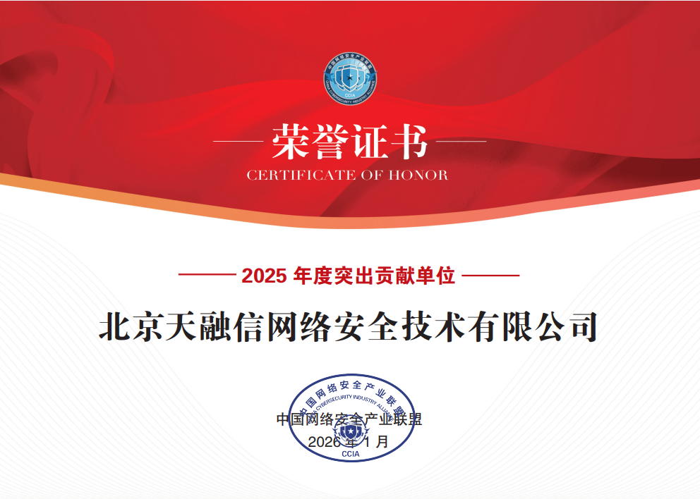 近日,中国网络安全产业联盟(以下简称“CCIA”)正式发布2025年度表彰先进的决定。天融信凭借深厚的技术积淀与坚定的企业担当,连续5年斩获“年度先进会员单位”荣誉。此外,天融信获评“2025年度突出贡献单位”。