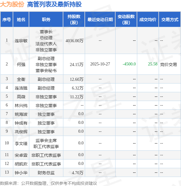大为股份:10月28日高管何强、连浩臻减持股份合计3.26万股